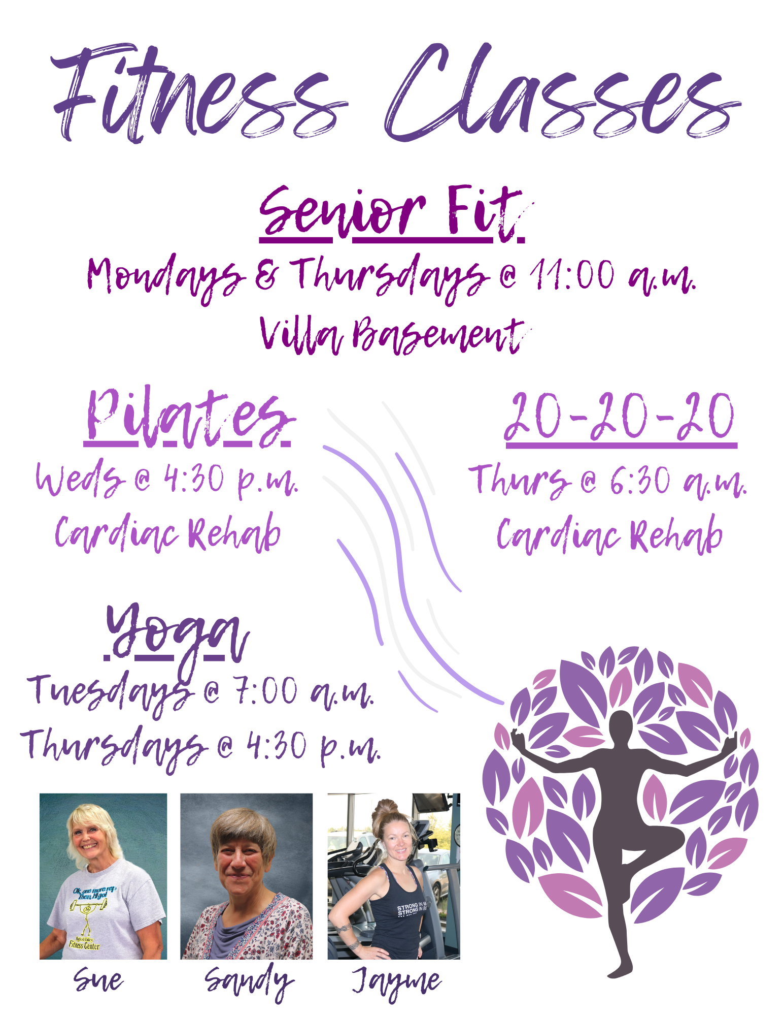A variety of classes are available onsite in the Fitness Gym (located next to the Rehab Department). New classes are constantly being developed to meet participants’ needs. Call the Fitness Center with your ideas.